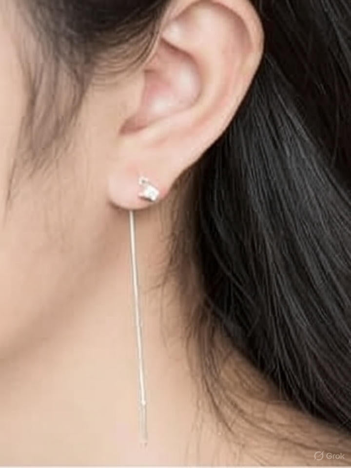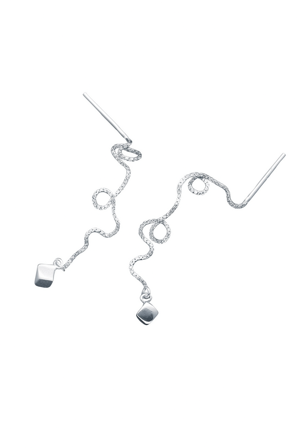 Cercei lungi, moderni, realizați din argint 925, cu un design fluid tip lanț subțire care se ondulează elegant. Capătul fiecărui cercel este accentuat de un mic cub metalic, adăugând o notă minimalistă și sofisticată. Perfecti pentru un look rafinat, dar discret.